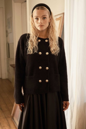 Gold Düğme Detaylı Tüylü Siyah Hırka