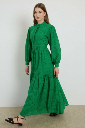 Aller Detaylı Dokulu Saten Yağ Yeşili Elbise