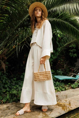 Nervürlü Ekru Krep Pantolon