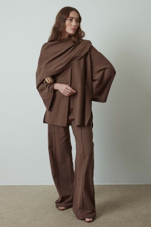 Şal Aksesuarlı Kahve Keten Ceket