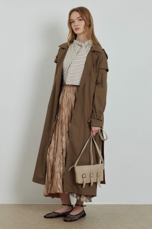 Metalik Aksesuarlı Oversize Haki Trençkot