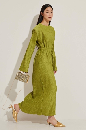 Aller Detaylı Dokulu Saten Fıstık Yeşili Elbise