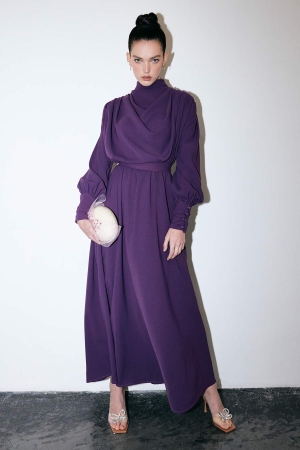 Taş Aksesuarlı Drapeli Krep Mürdüm Elbise