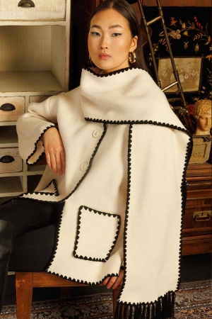 Şal Yaka Biyeli Triko Hırka - Ekru
