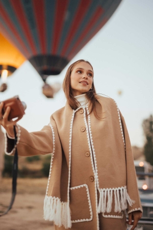 Şal Yaka Biyeli Triko Hırka - Camel