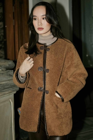 Aplikeli Kürklü Deri Ceket - Camel