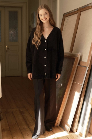 Premium Taş Düğmeli Siyah Hırka