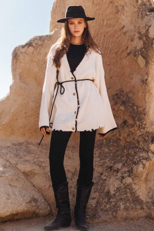 Şerit Detaylı Yırtıklı Triko Hırka - Krem