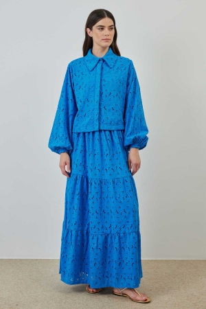 Saks mavisi gibi rengi. Normalde s beden giyiniyorum etek beli s/m gerçekten biraz büyük geldi. Ama beli lastikli olduğu için çok sorun değil. Ben en çok eteğin tok duruşunu ağırlığını beğendim. Gerçekten çok kaliteli duruşu var.