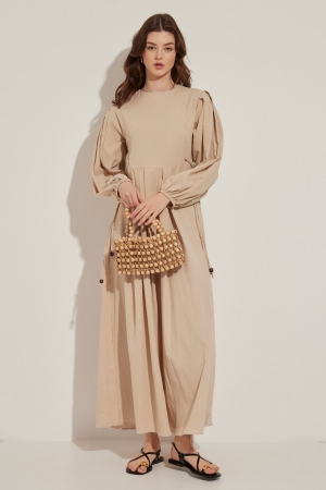 Yandan Bağlamalı Sütlü Kahve Keten Elbise