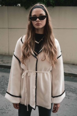 Biye İşleme Detaylı Krem Hırka