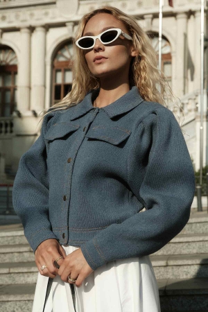 Metal Düğmeli Triko Bomber İndigo Ceket